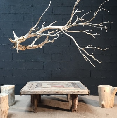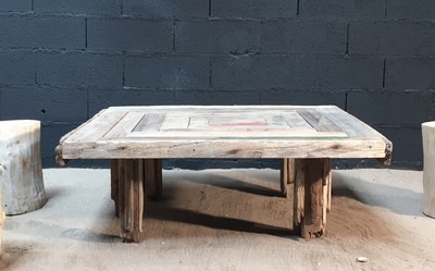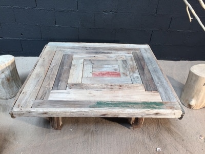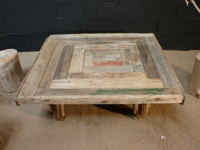 Cette table basse est réalisée à partir de véritables planches en bois flotté vieillies et patinées par les flots. Elle mesure 120cm par 120cm et 45cm de hauteur.
