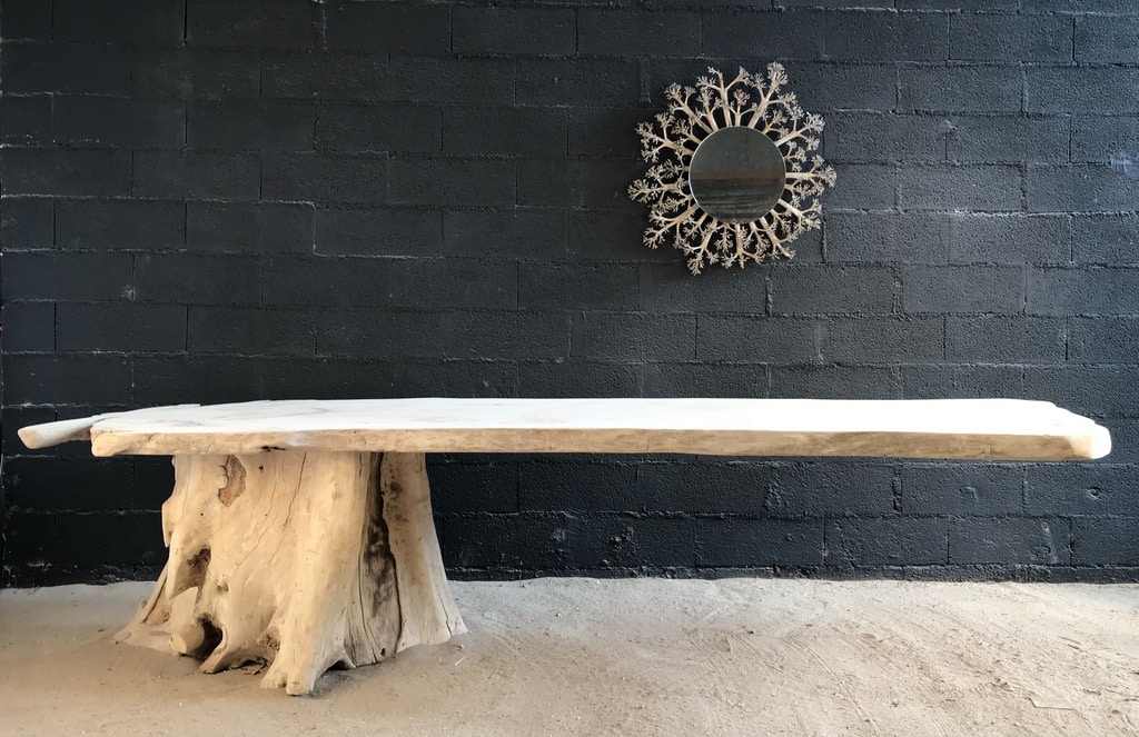 Le plateau de cette table repose sur une souche en bois flotté. Elle est maintenue par un système de contrepoids à l’intérieur de la souche. Elle peut être réalisée sur mesure.