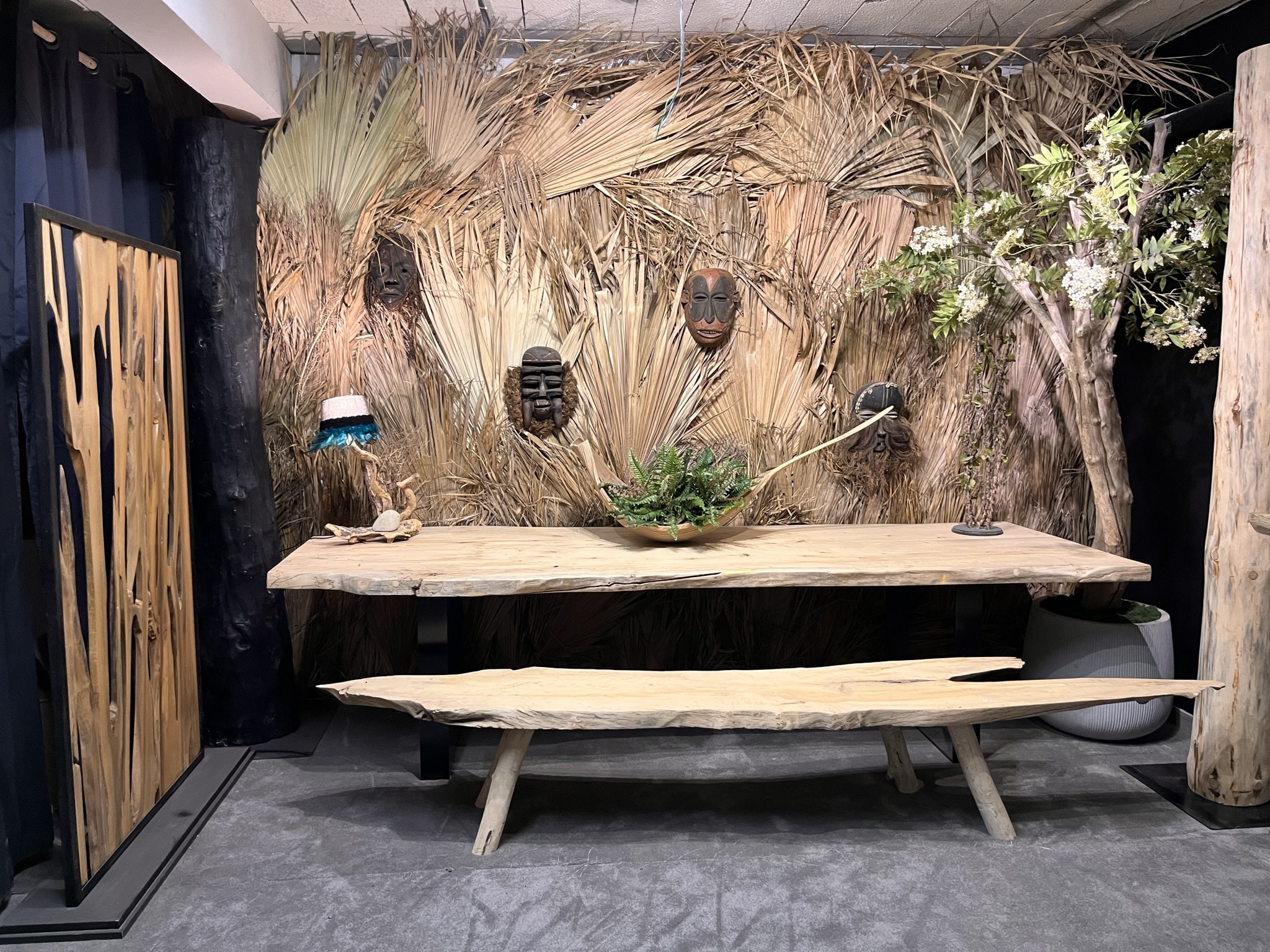 Cette table est réalisée en bois flotté.