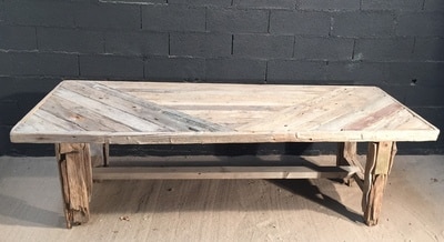 Cette table est construite à partir de véritables planches de bois flotté , vieillies et polies par les flots et assemblées façon marqueterie.