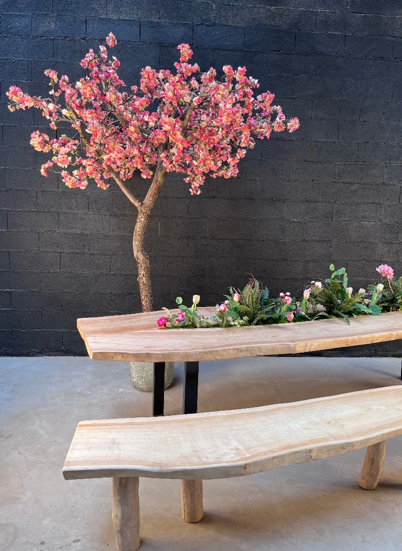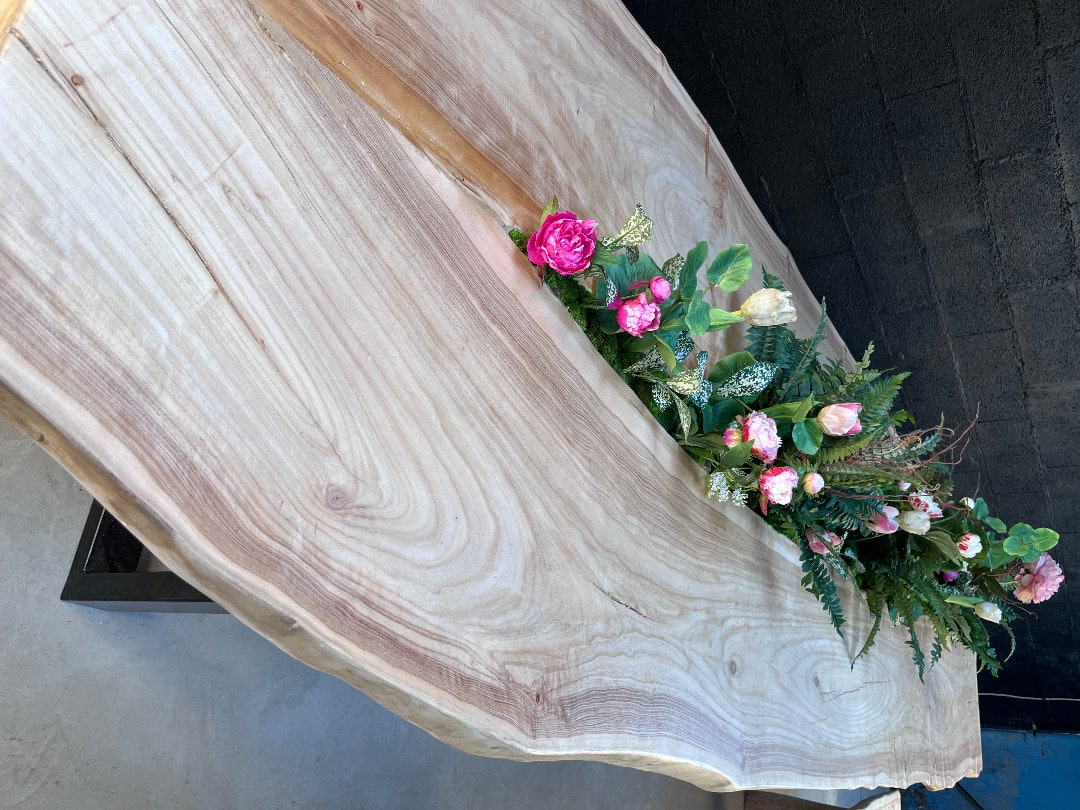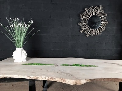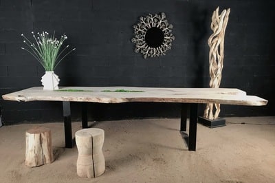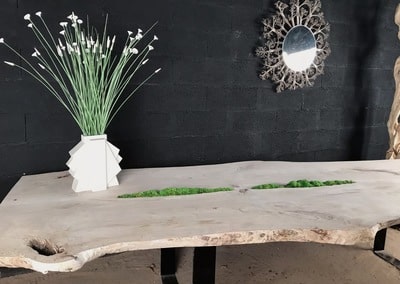Cette table est réalisée avec des planches en bois flotté. L’assemblage de celles-ci est réalisé de façon traditionnelle. Elle mesure environ 3m50 par 90cm de largeur. Les pieds sont en acier peint en noir. C’est une peinture cuite au four. Elle peut être réalisée sur mesure.